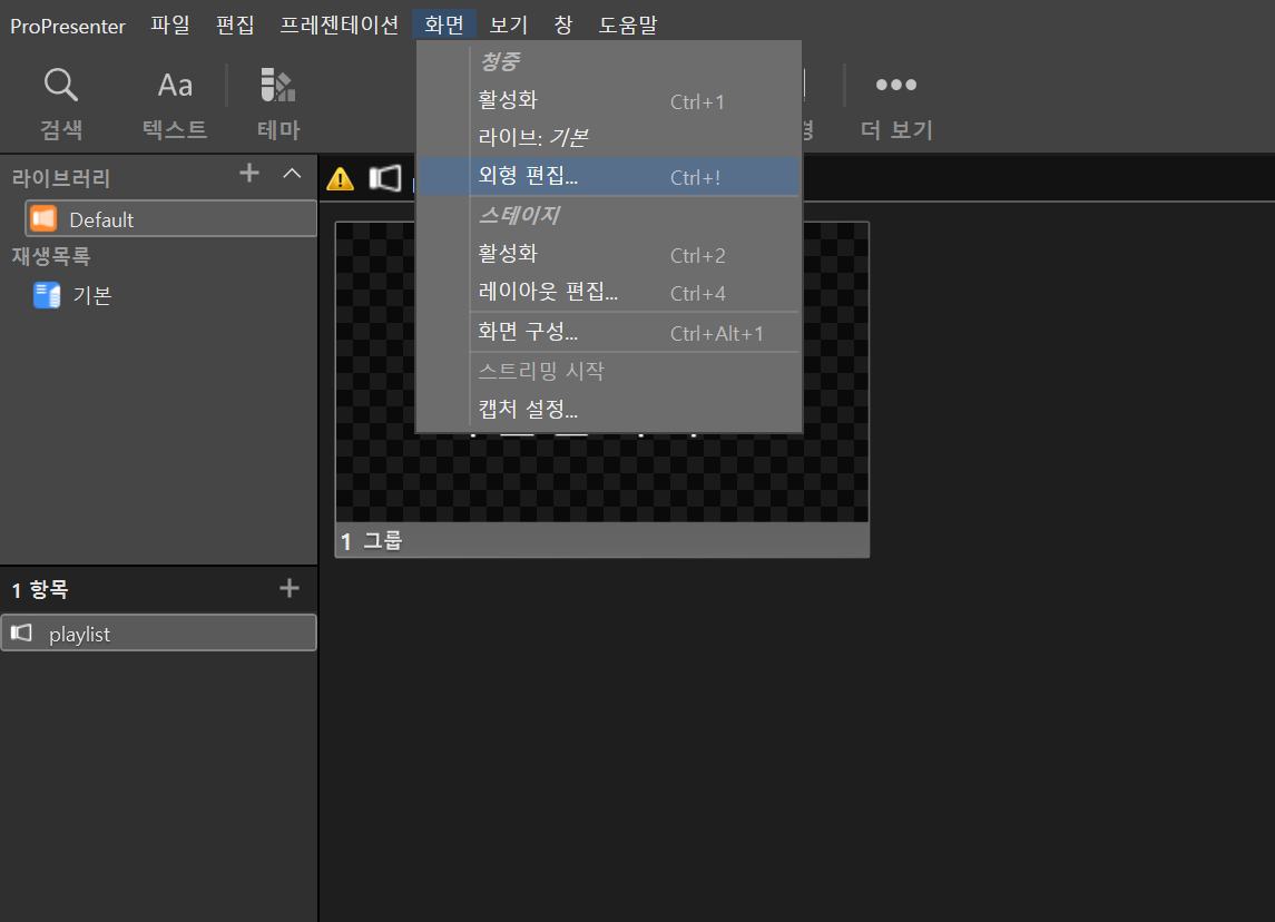 화면에서 외형편집을 선택합니다. 단축키로는 Ctrl+! 입니다.