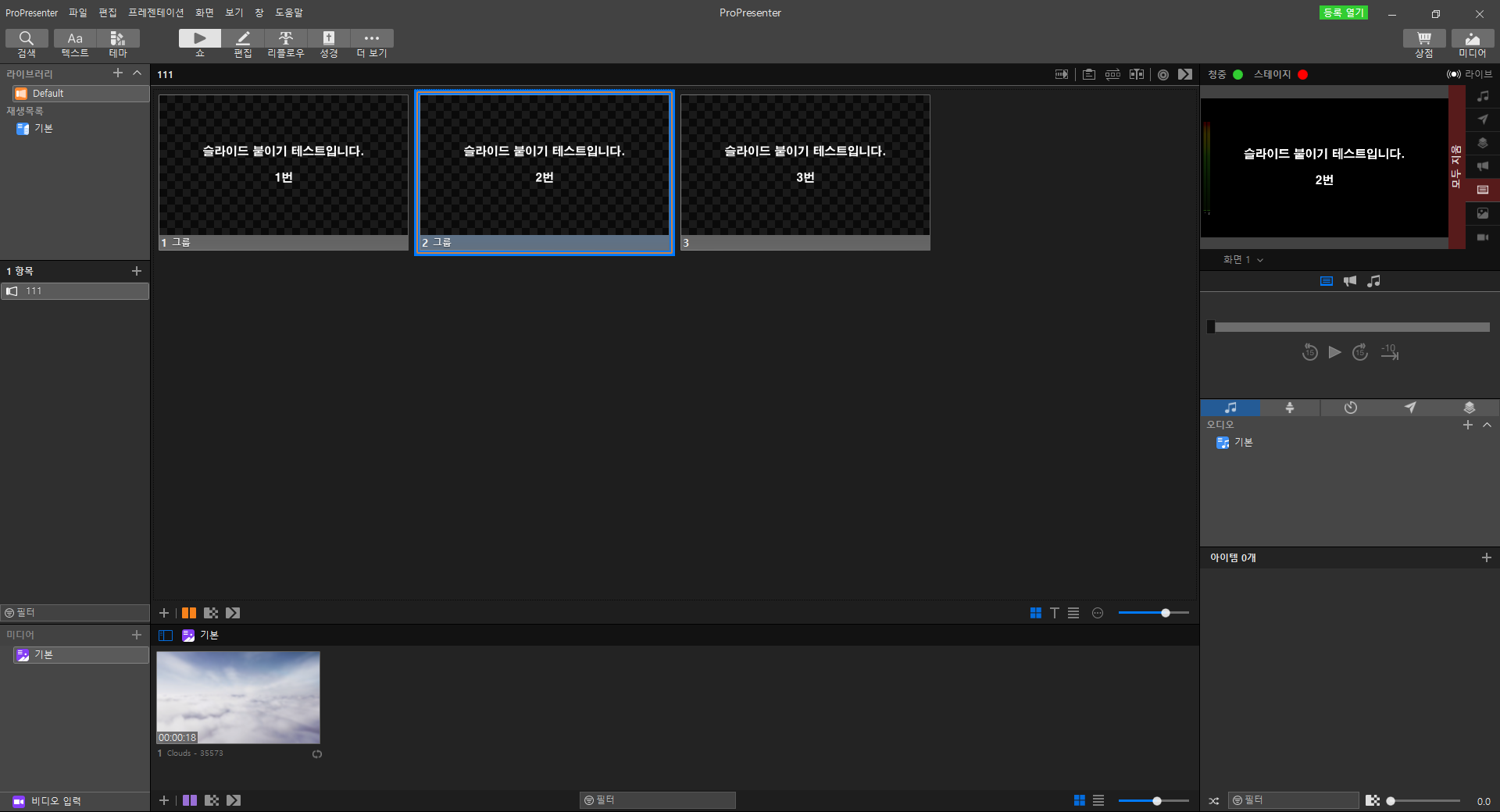 아래 화면은 첫번째 슬라이드를 복사한 상태이고 여기에서 2번 슬라이드 출력중이고 ctrl v 를 해보겠습니다.